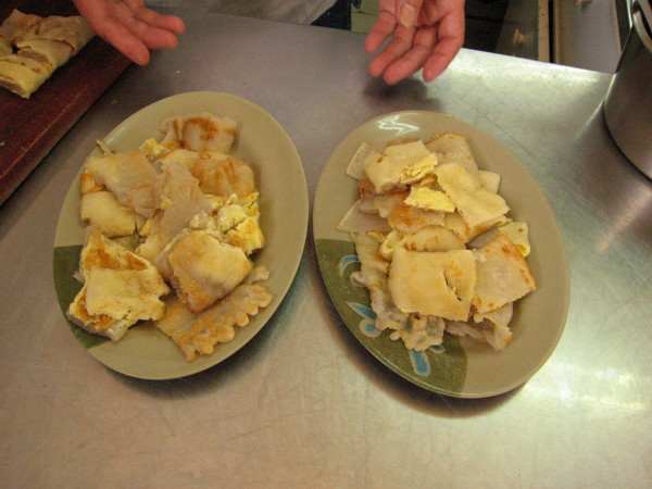 當然店裡的招牌就是蛋餅囉,特點就在於餅皮是老闆每天清晨調製,並非工廠加工,所以餅皮厚度比較厚,再加上麵粉裡的獨家配方,吃起來特別的Q.趁熱吃當然很好吃,不一樣在於即使放到冷掉,皮的Q度會讓人印象深刻.可以要求老闆煎的焦一點點,如此便會又香又Q.標準的尺寸一份是25元,但熟客都知道可以跟老闆說買40元的蛋餅,避免兩份吃不完.醬汁的部份有醬油,甜辣醬,蕃茄醬三種可以選擇,都可以試看看,味道都很不錯.